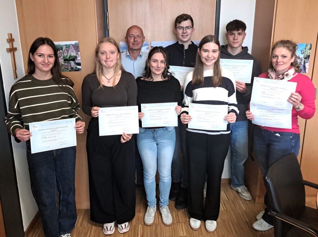 Acht engagierte Schülerinnen und Schüler unserer Schule haben im Schuljahr 2024/2025 erfolgreich an den DELF-Prüfungen (Diplôme d’Études en Langue Française) teilgenommen. Fünf von ihnen absolvierten die Prüfung auf Niveau B1, die anderen auf Niveau B2 – eine großartige Leistung, die ihren Fleiß und ihre Begeisterung für die französische Sprache zeigt.