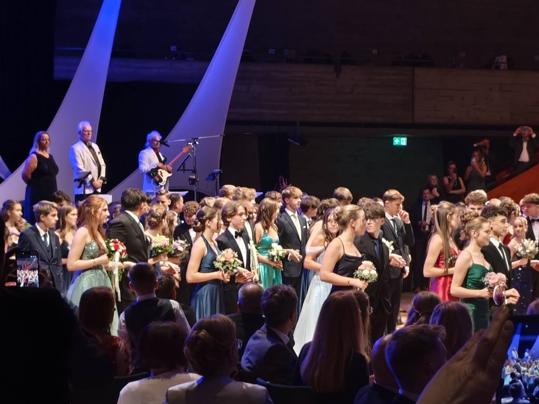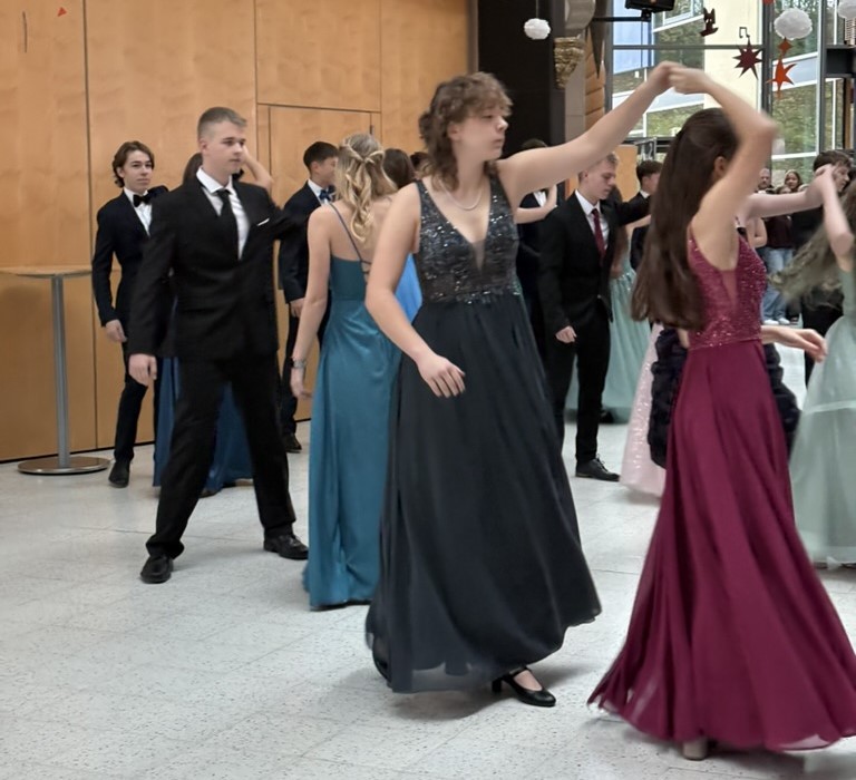 Letzten Samstag fand im Stadttheater in Ingolstadt der feierliche Abschlussball des Tanzkurses unserer 10 Klässler statt. Perfekt organisiert von der Tanzschule Swing & Fun unter der Leitung von Tanzlehrer Thomas Kleimaier zeigten die jungen Tänzer in schicker Abendrobe ihr Können. Da sie dieses Können auch gern ihren Mitschülern zeigen, ist es zur Tradition geworden, dass am Montag nach dem Abschlussball nochmals in der Schule getanzt wird. In der ersten Pause zeigten die Schülerinnen und Schüler in voller Abendrobe nochmals einen kleinen Ausschnitt aus ihrem Repertoire! Conférencier und DJ in Personalunion ist seit Jahren unser Musiklehrer Herr Sandt.