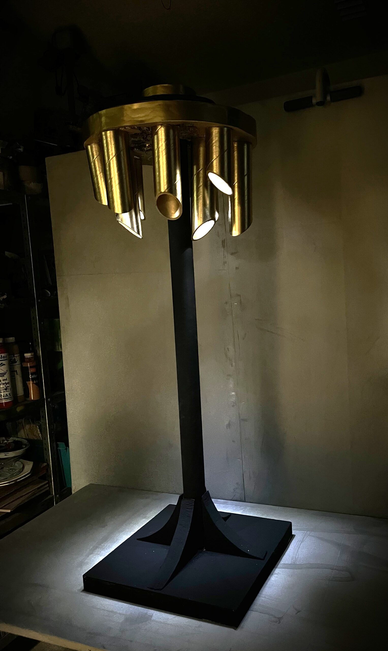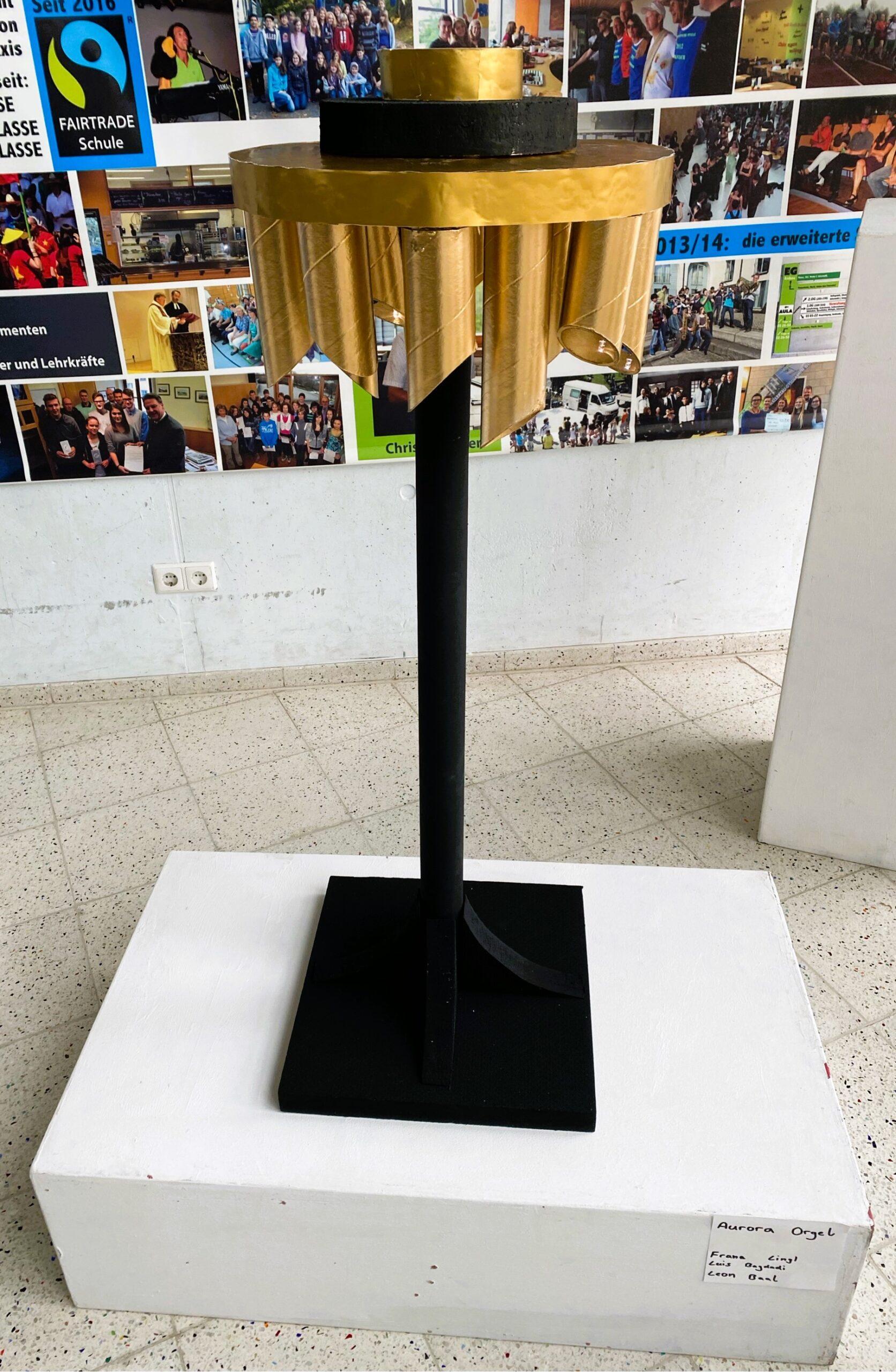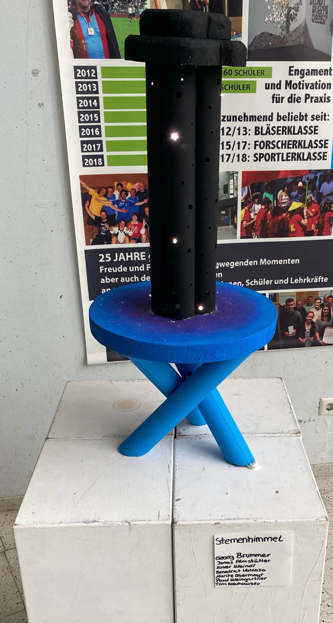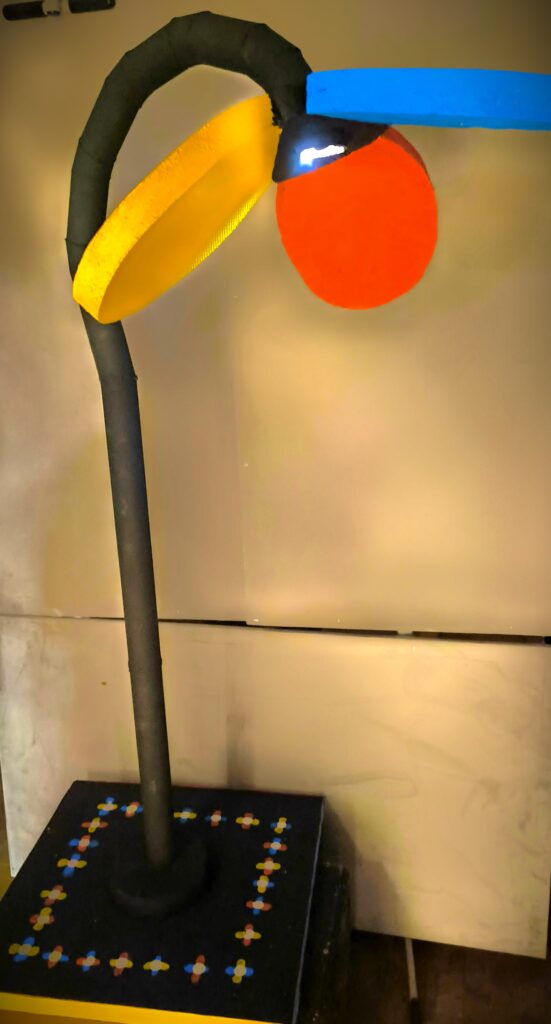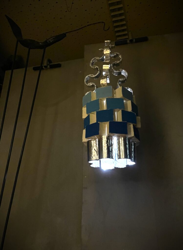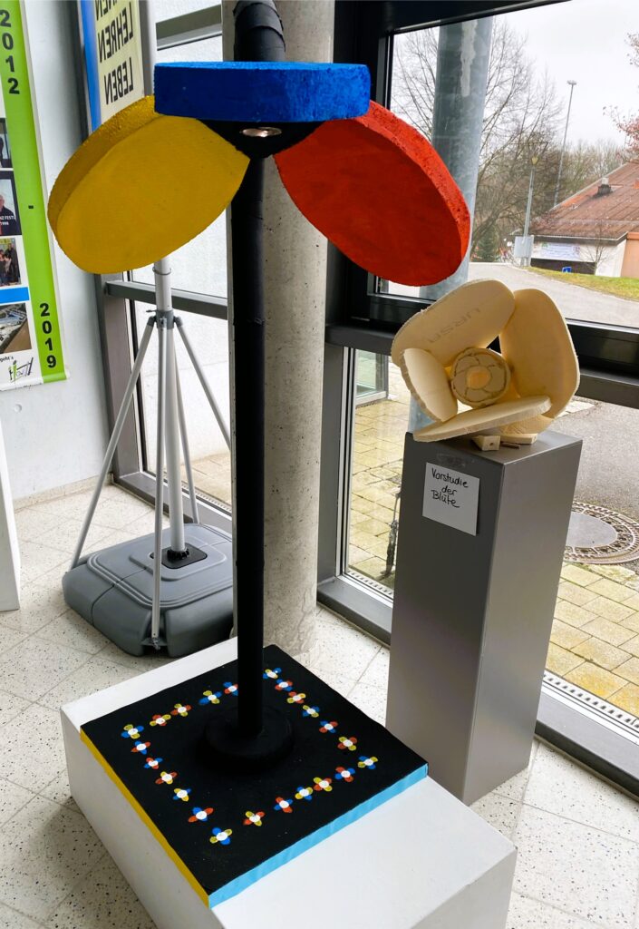 Im Rahmen des Kunstunterrichts bei Hrn. Kuttler in der 11. Jahrgangsstufe wurde das Thema Lampendesign gewählt. Ausgehend von den Design-Ikonen des Bauhauses versuchten die Schülerinnen und Schüler mit nur zwei Werkstoff-Vorlagen (Pappröhren und Styrodur Platten) eine Zimmerlampe zu entwerfen. Nach einer Skizzenphase, in der die Gruppen heftig diskutierten, kam es zur praktischen Umsetzung der Ideen. Bald stellte sich jedoch heraus, dass nicht jede Skizze Eins zu Eins umzusetzen war und neue Lösungen gemeinsam gefunden werden mussten.