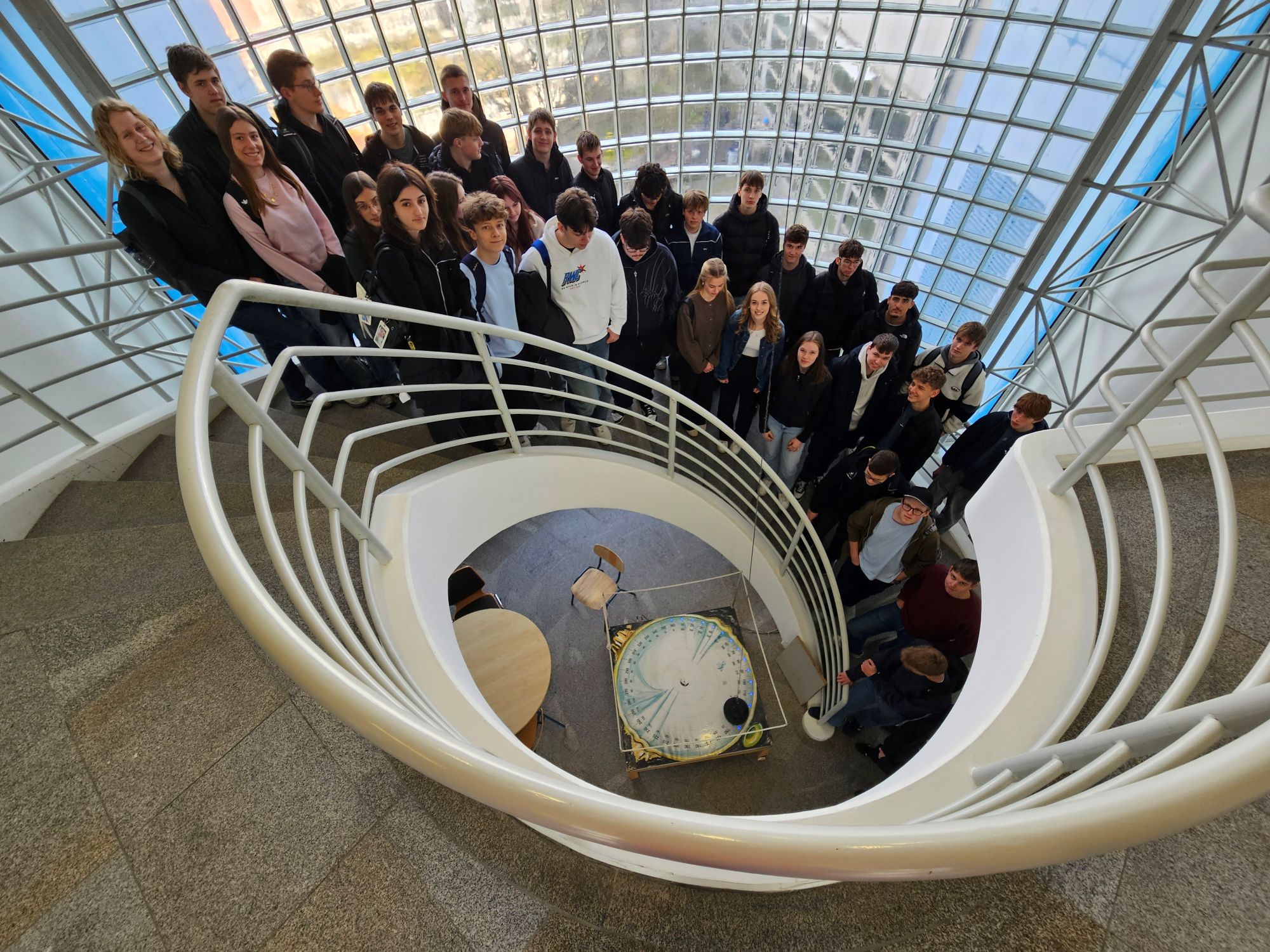 Nach einem Gruppenfoto am Foucaultschen Pendel der Physik-Fakultät, schlenderten wir über den Campus zum Bereich Mathematik/Informatik, machten dort Mittagspause oder testeten die Rutschbahnen. Wir hatten Glück und konnten nebenbei auch durch die Messestände der eben stattfindenden Konferenz „Intelligent Vehicles & Production“ gehen. Den Abschluss bildete ein Besuch der Ausstellung des Planetariums ESO Supernova und der Show „Welten jenseits der Erde“. Insgesamt ein sehr schöner Ausflug in die Physik jenseits des Unterrichts.